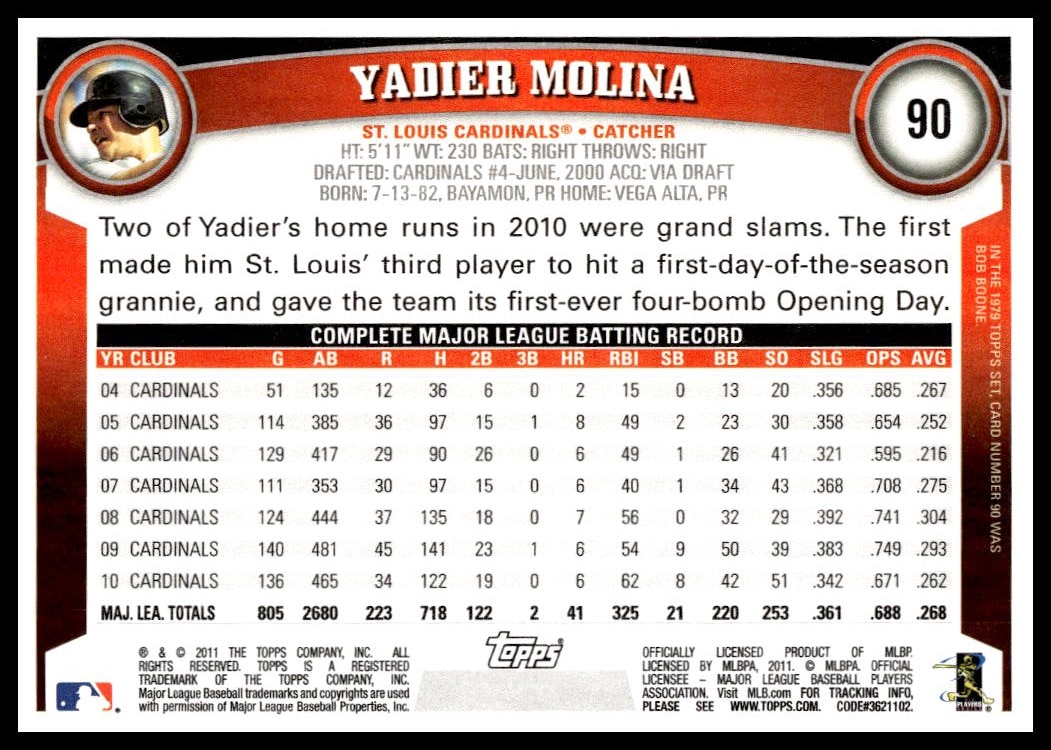 This Baseball card, from 2011 is part of the Topps  card set. Yadier Molina is featured and has a card number of 90.