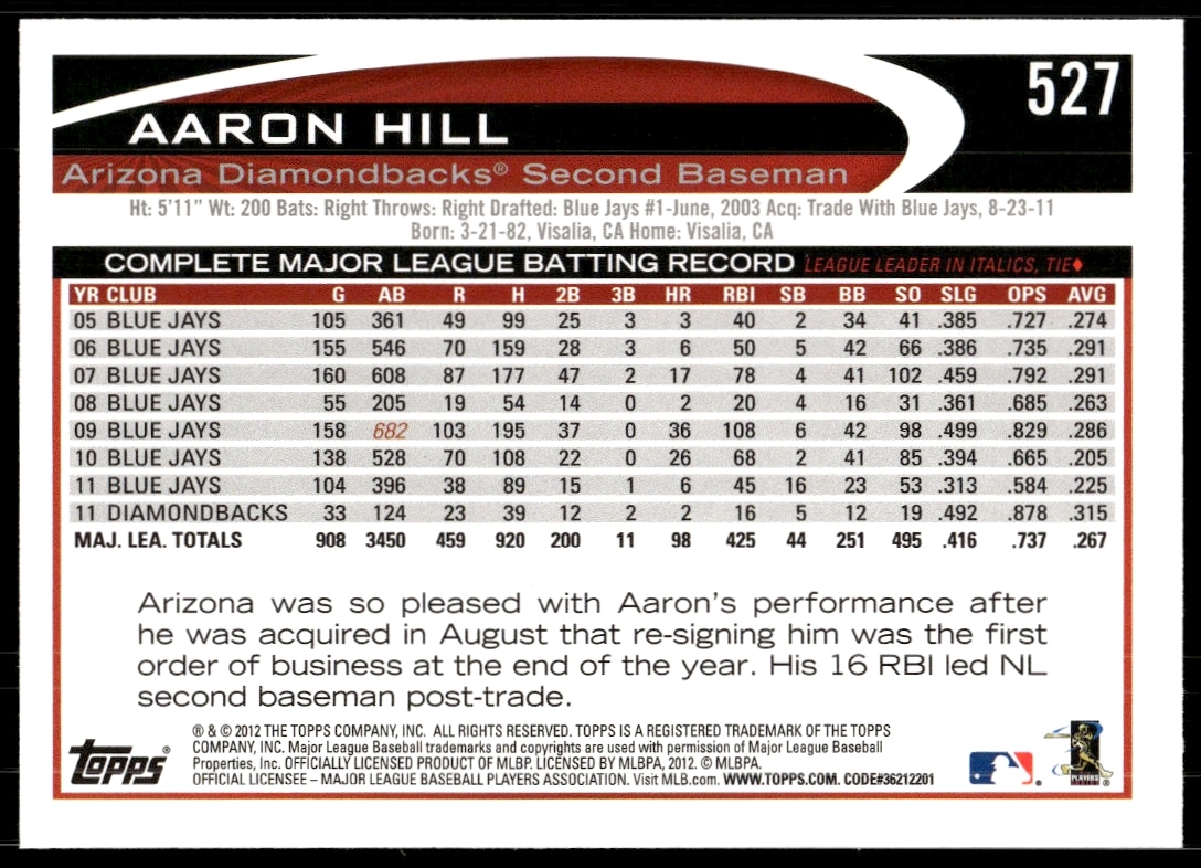 This Baseball card, from 2012 is part of the Topps card set. Aaron Hill is featured and has a card number of 527.