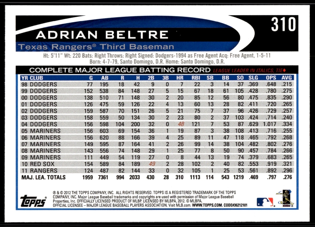 This Baseball card, from 2012 is part of the Topps card set. Adrian Beltre is featured and has a card number of 310.