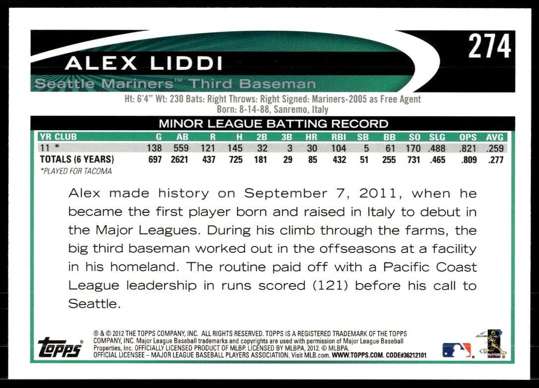 This Baseball card, from 2012 is part of the Topps card set. Alex Liddi is featured and has a card number of 274.