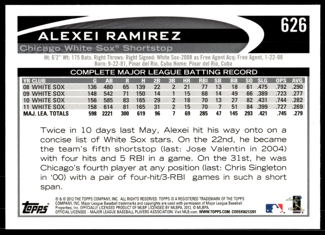 This Baseball card, from 2012 is part of the Topps card set. Alexei Ramirez is featured and has a card number of 626.