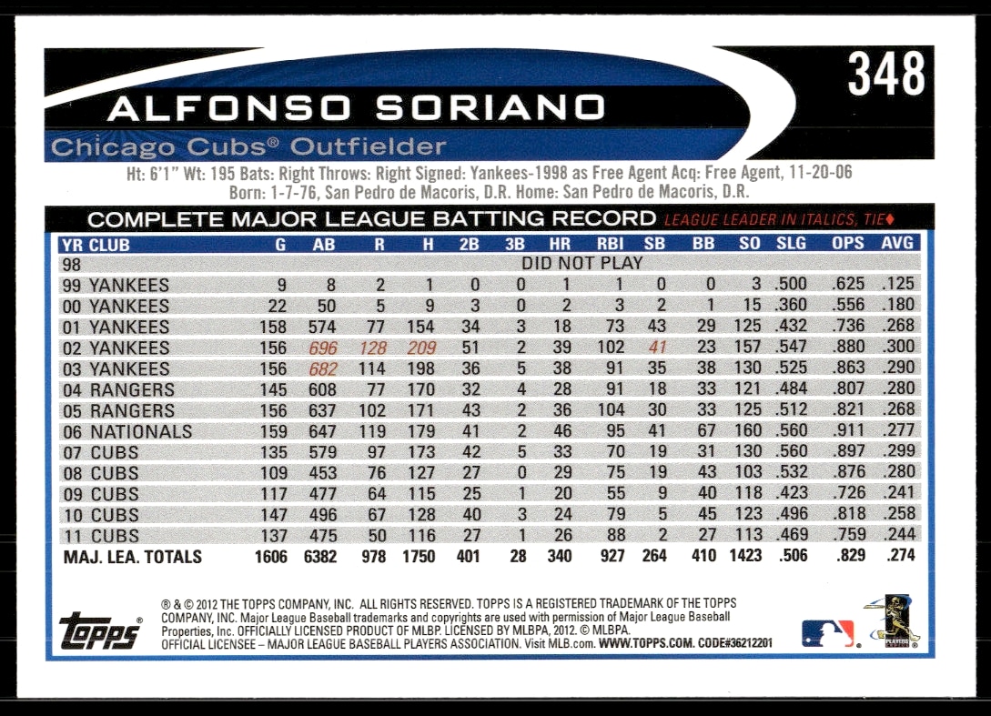 This Baseball card, from 2012 is part of the Topps card set. Alfonso Soriano is featured and has a card number of 348.