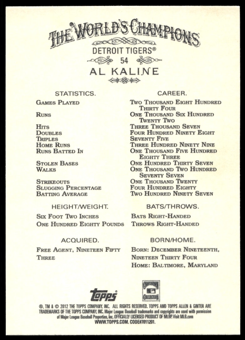 This Baseball card, from 2012 is part of the Topps Allen & Ginter card set. Al Kaline is featured and has a card number of 54.