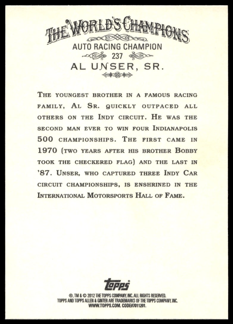 This Baseball card, from 2012 is part of the Topps Allen & Ginter card set. Al Unser is featured and has a card number of 237.