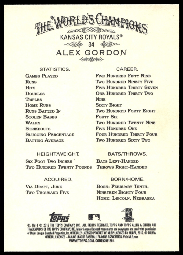 This Baseball card, from 2012 is part of the Topps Allen & Ginter card set. Alex Gordon is featured and has a card number of 34.