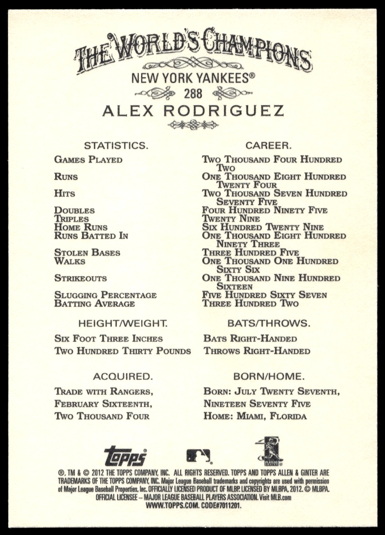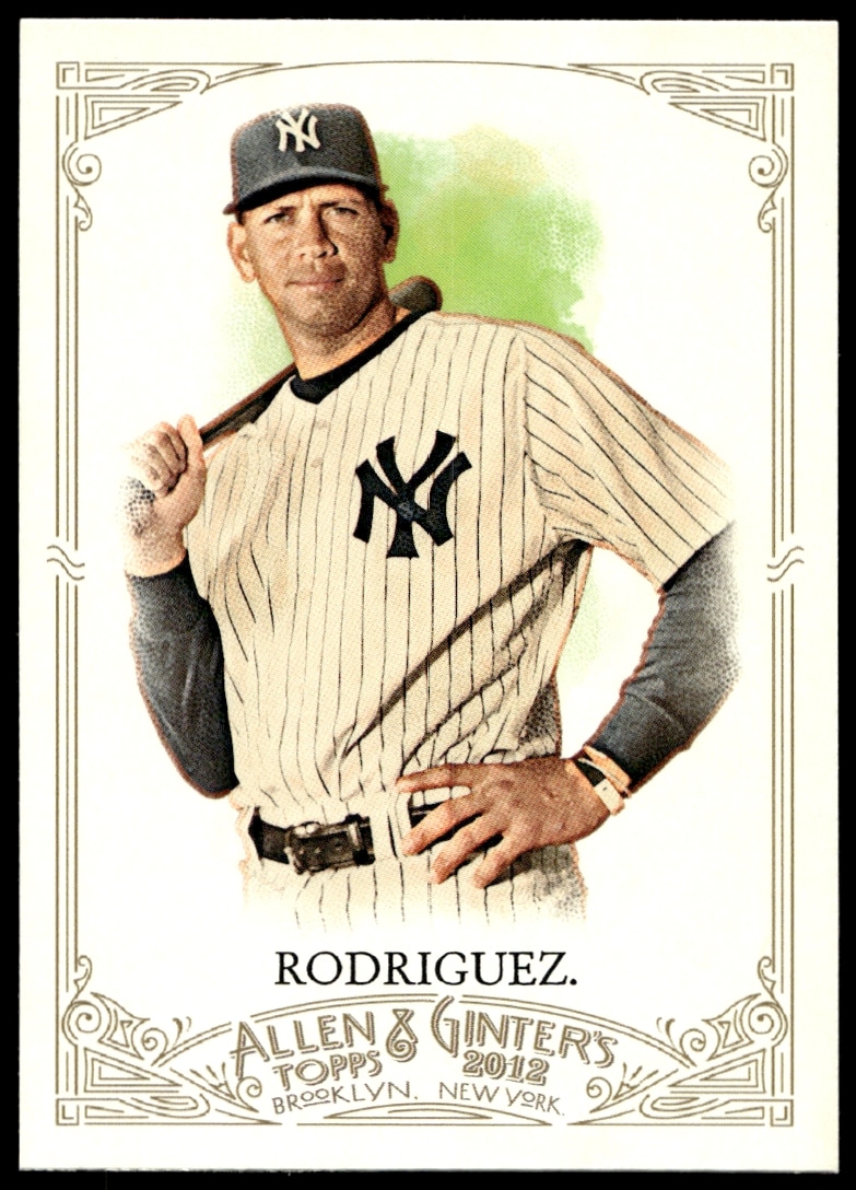 This Baseball card, from 2012 is part of the Topps Allen & Ginter card set. Alex Rodriguez is featured and has a card number of 288.