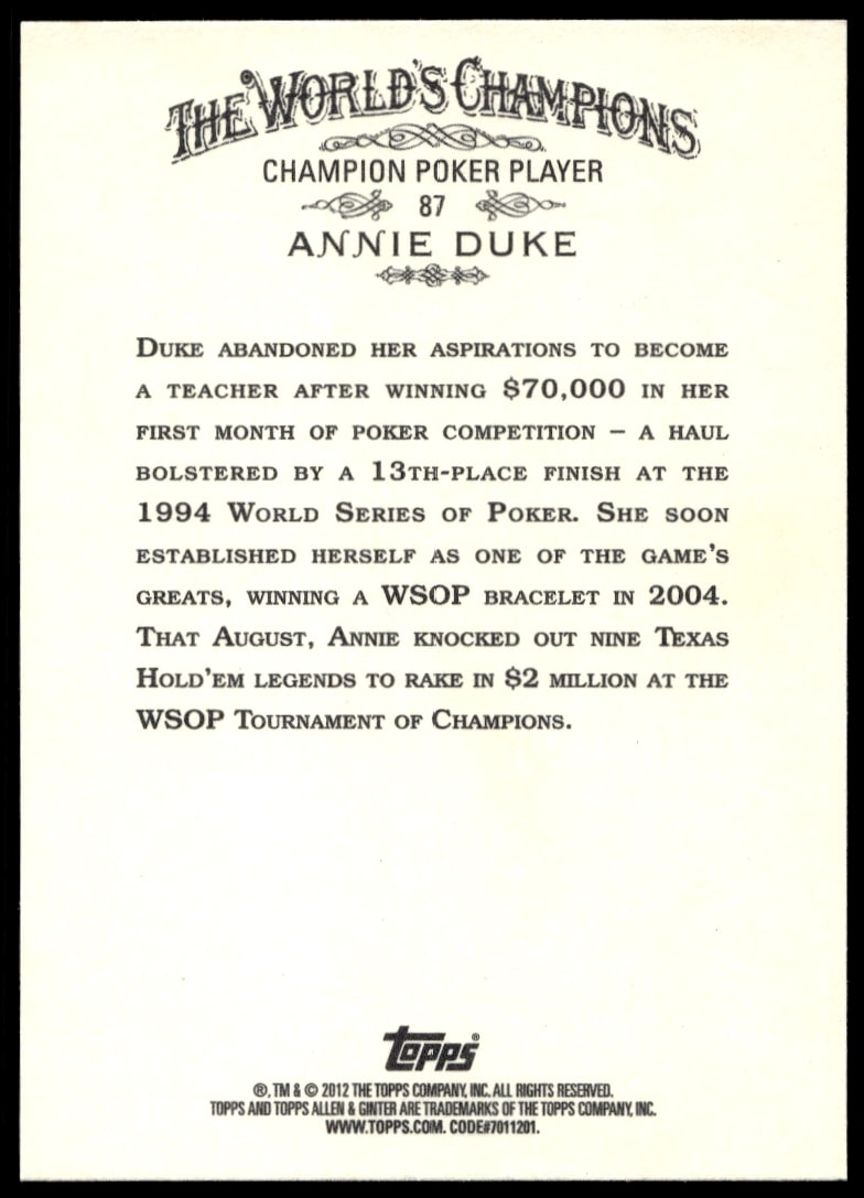 This Baseball card, from 2012 is part of the Topps Allen & Ginter card set. Annie Duke is featured and has a card number of 87.