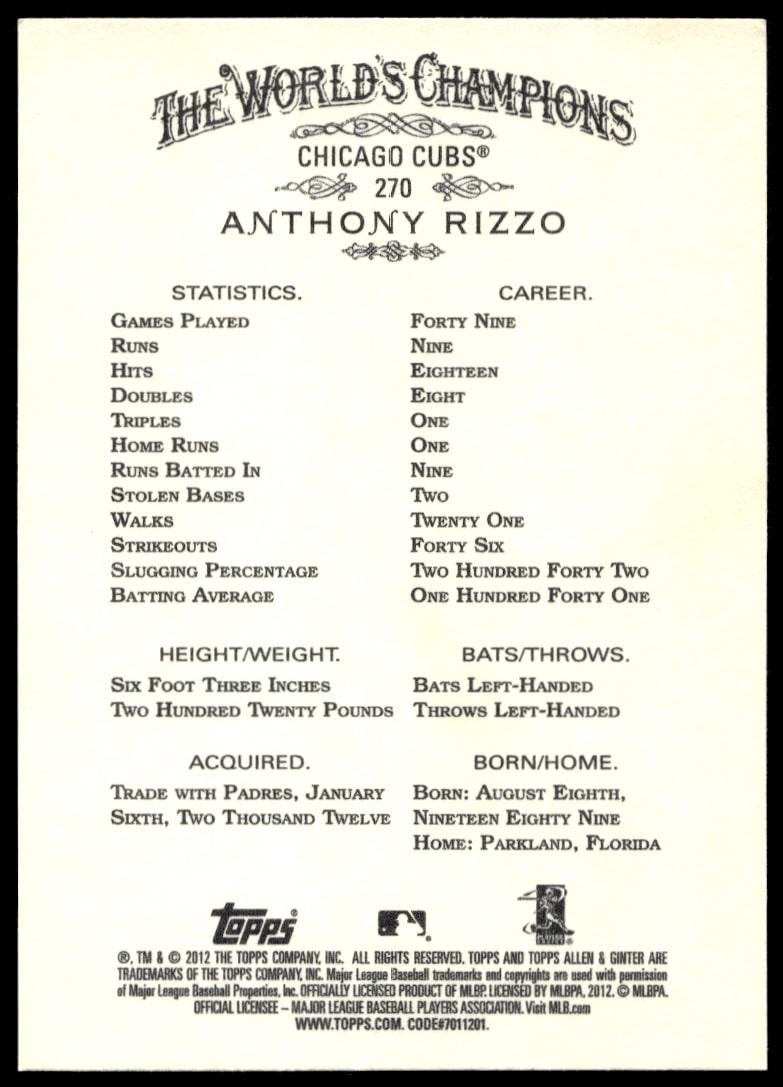 This Baseball card, from 2012 is part of the Topps Allen & Ginter card set. Anthony Rizzo is featured and has a card number of 270.