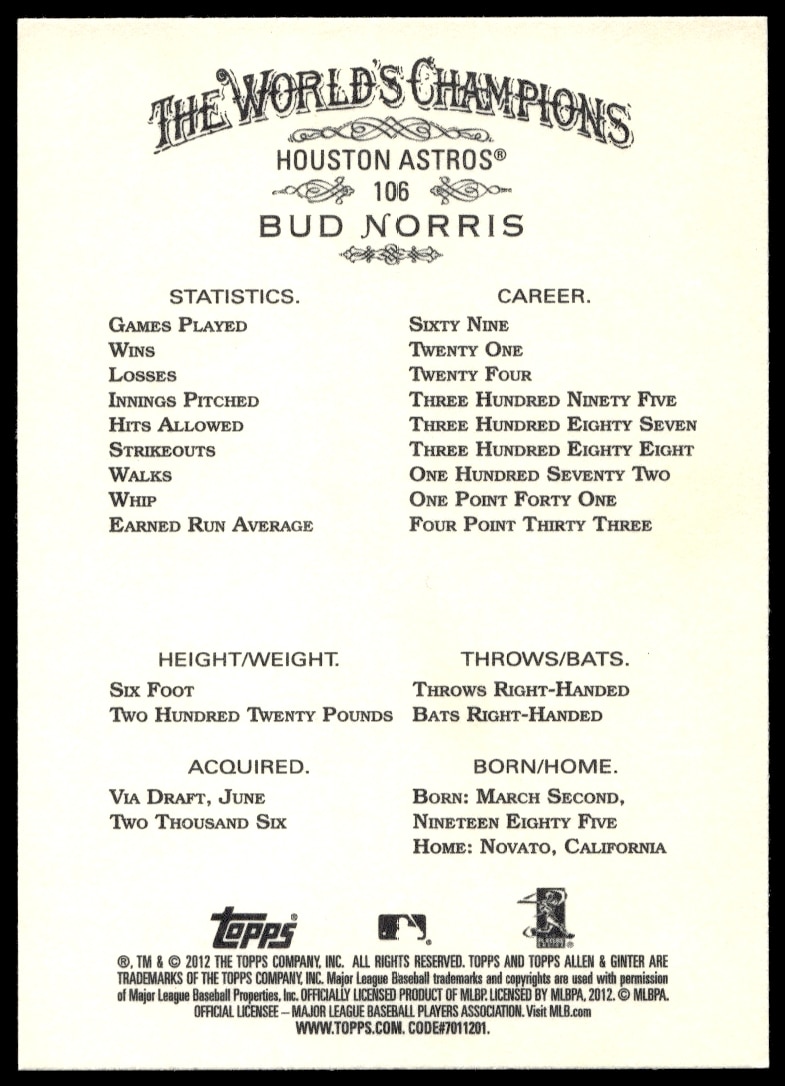 This Baseball card, from 2012 is part of the Topps Allen & Ginter card set. Bud Norris is featured and has a card number of 106.