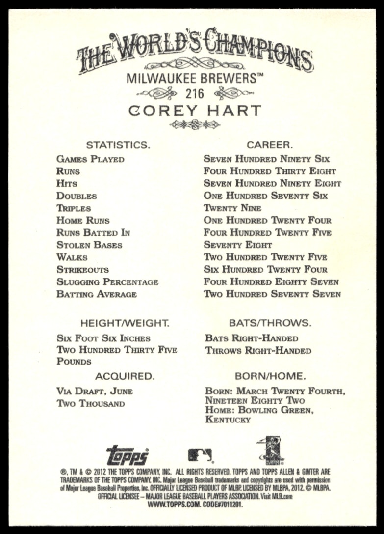 This Baseball card, from 2012 is part of the Topps Allen & Ginter card set. Corey Hart is featured and has a card number of 216.