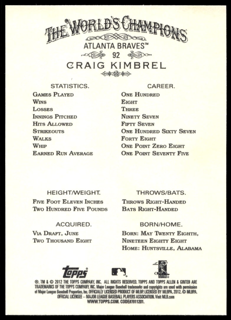 This Baseball card, from 2012 is part of the Topps Allen & Ginter card set. Craig Kimbrel is featured and has a card number of 92.