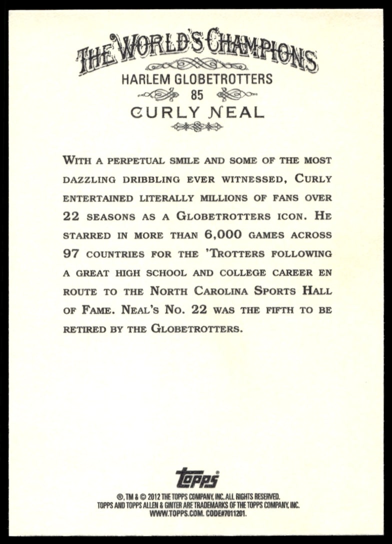 This Baseball card, from 2012 is part of the Topps Allen & Ginter card set. Curly Neal is featured and has a card number of 85.