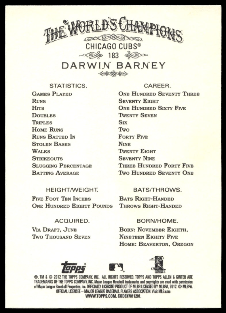 This Baseball card, from 2012 is part of the Topps Allen & Ginter card set. Darwin Barney is featured and has a card number of 183.