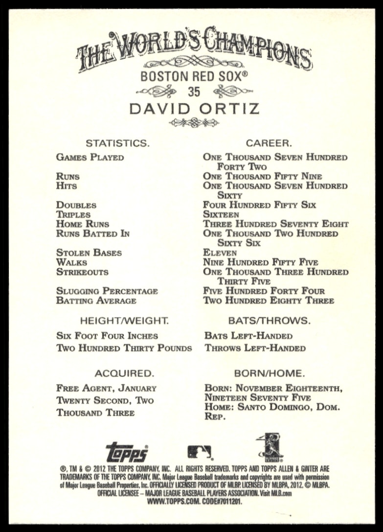 This Baseball card, from 2012 is part of the Topps Allen & Ginter card set. David Ortiz is featured and has a card number of 35.