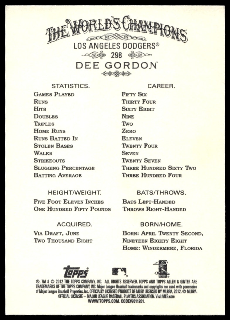 This Baseball card, from 2012 is part of the Topps Allen & Ginter card set. Dee Gordon is featured and has a card number of 298.