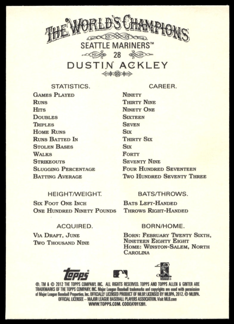 This Baseball card, from 2012 is part of the Topps Allen & Ginter card set. Dustin Ackley is featured and has a card number of 28.