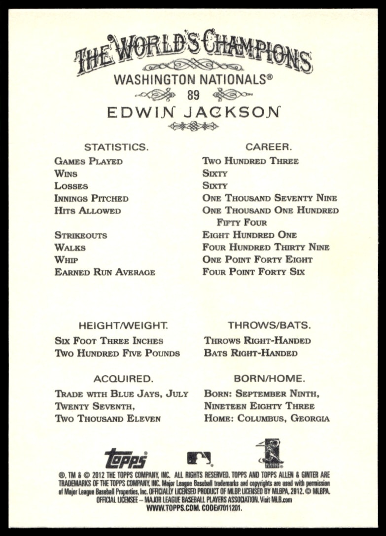 This Baseball card, from 2012 is part of the Topps Allen & Ginter card set. Edwin Jackson is featured and has a card number of 89.