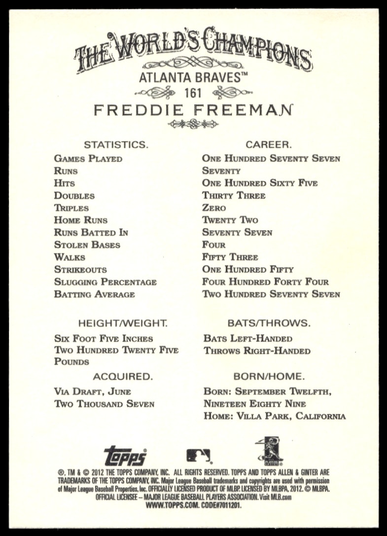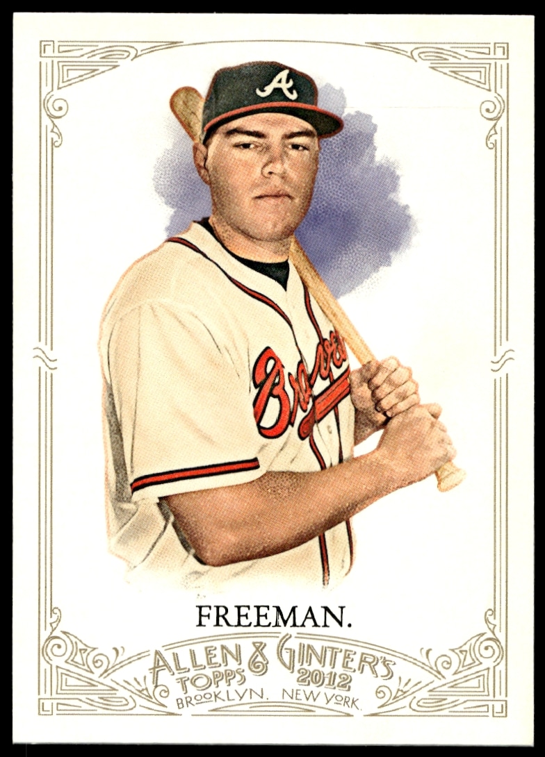 This Baseball card, from 2012 is part of the Topps Allen & Ginter card set. Freddie Freeman is featured and has a card number of 161.