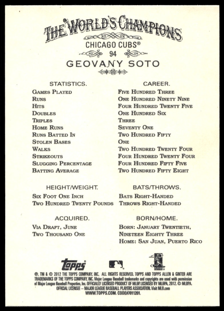 This Baseball card, from 2012 is part of the Topps Allen & Ginter card set. Geovany Soto is featured and has a card number of 94.