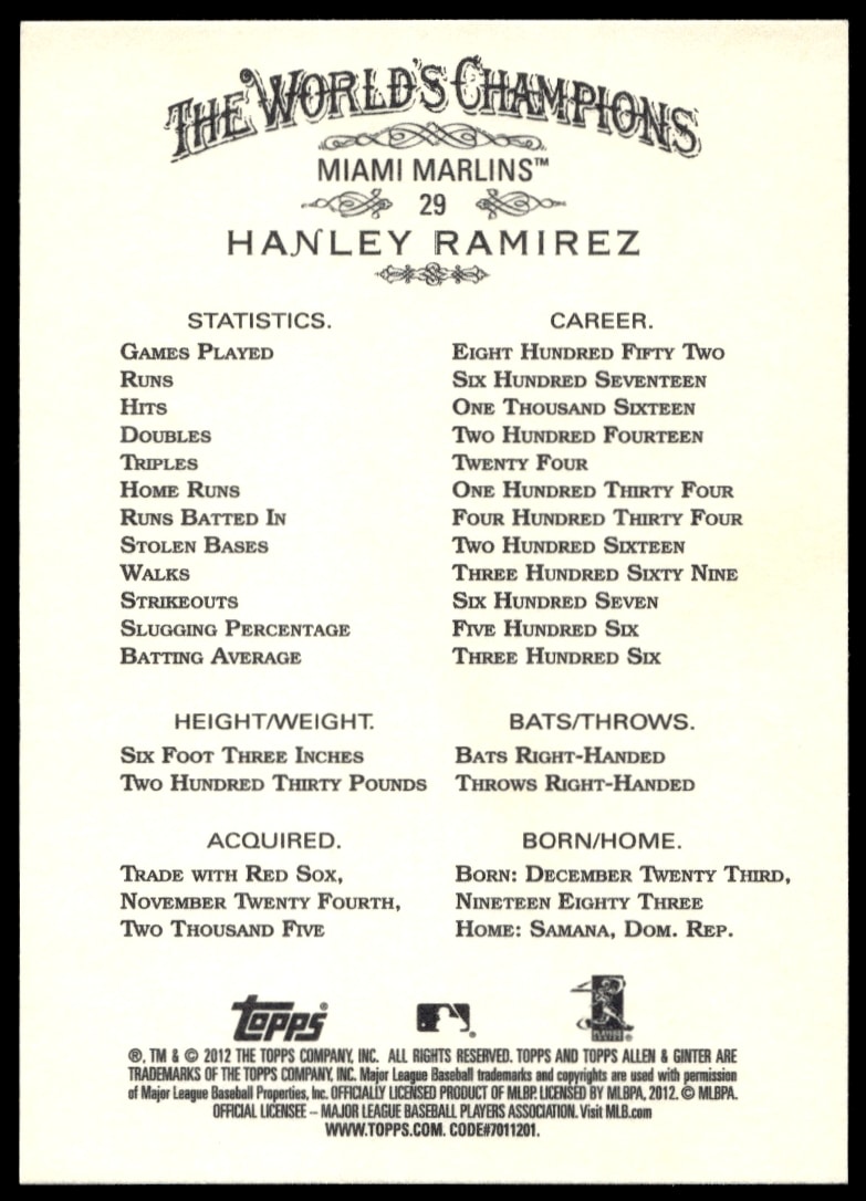 This Baseball card, from 2012 is part of the Topps Allen & Ginter card set. Hanley Ramirez is featured and has a card number of 29.
