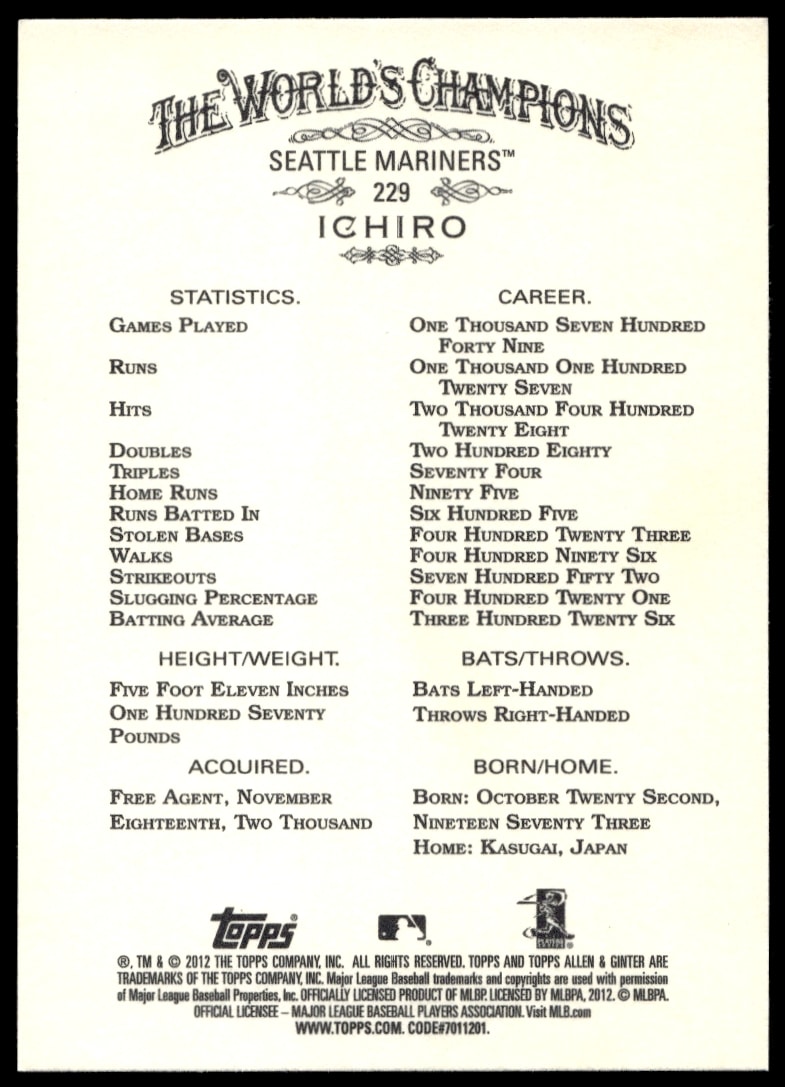 This Baseball card, from 2012 is part of the Topps Allen & Ginter card set. Ichiro Suzuki is featured and has a card number of 229.