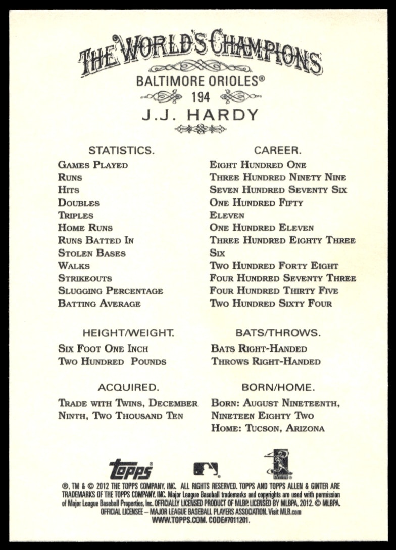 This Baseball card, from 2012 is part of the Topps Allen & Ginter card set. J.J. Hardy is featured and has a card number of 194.