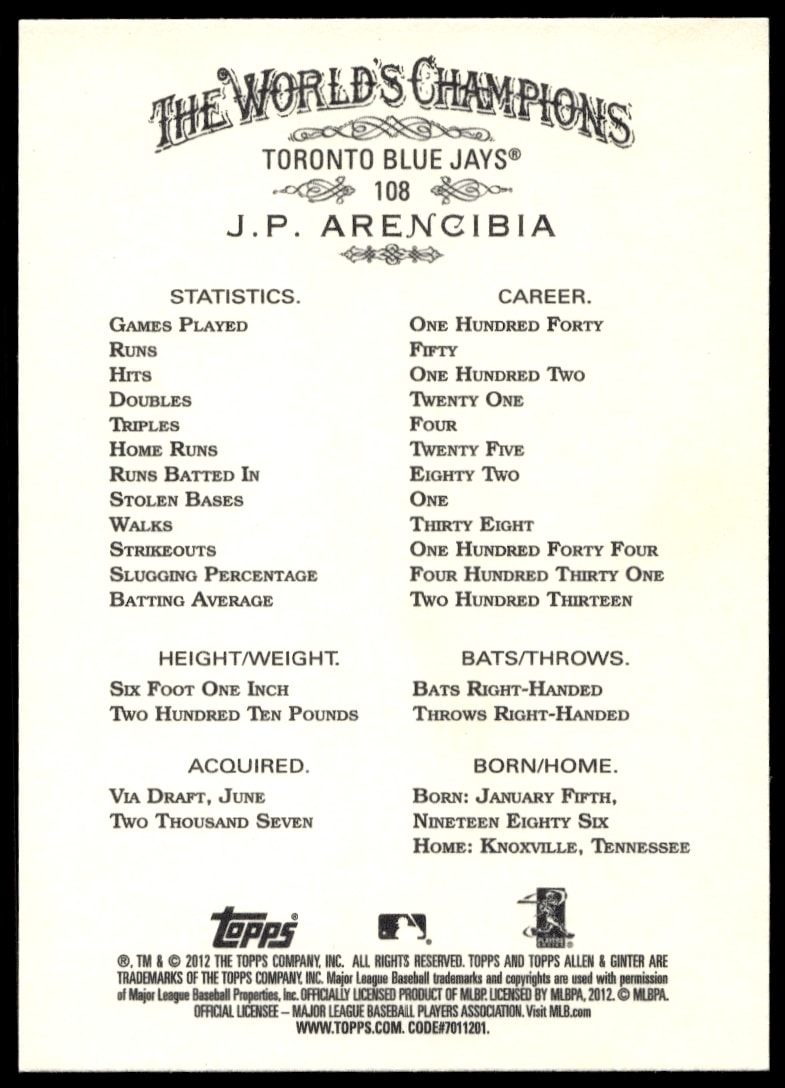 This Baseball card, from 2012 is part of the Topps Allen & Ginter card set. J.P. Arencibia is featured and has a card number of 108.