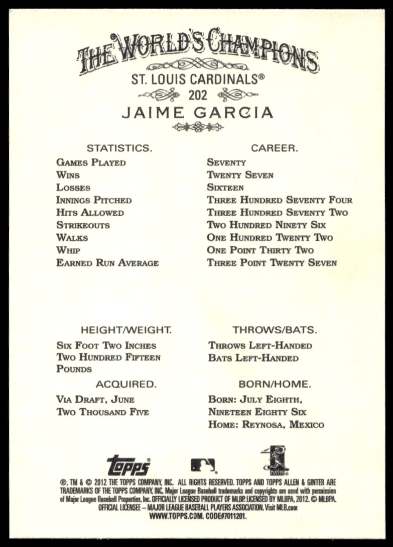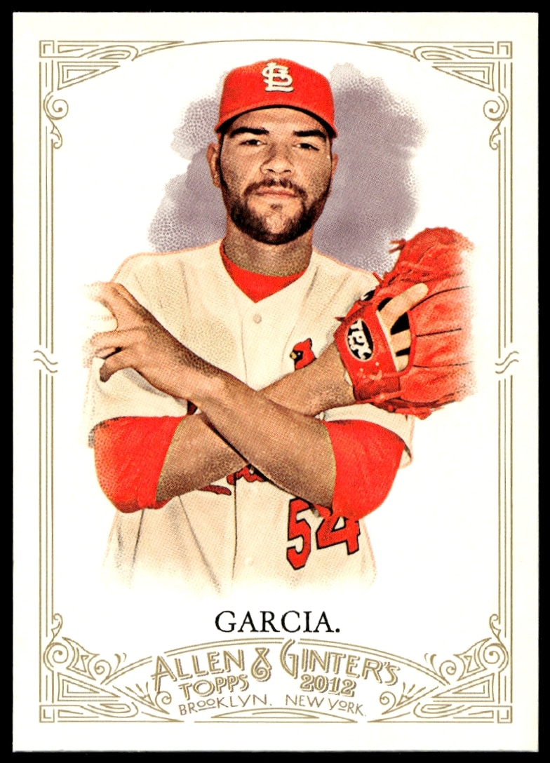 This Baseball card, from 2012 is part of the Topps Allen & Ginter card set. Jaime Garcia is featured and has a card number of 202.