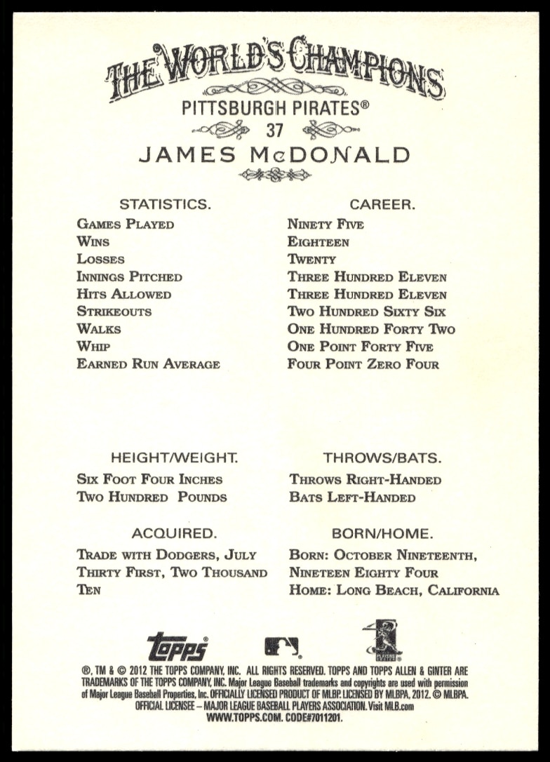 This Baseball card, from 2012 is part of the Topps Allen & Ginter card set. James McDonald is featured and has a card number of 37.