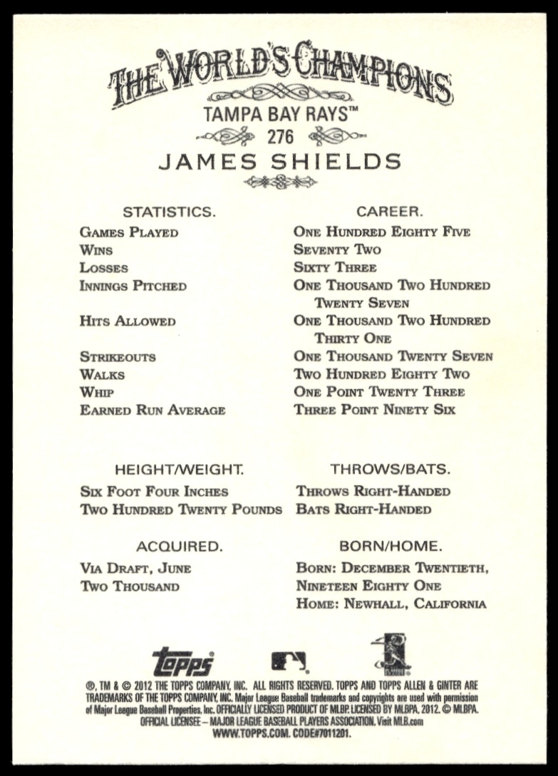 This Baseball card, from 2012 is part of the Topps Allen & Ginter card set. James Shields is featured and has a card number of 276.