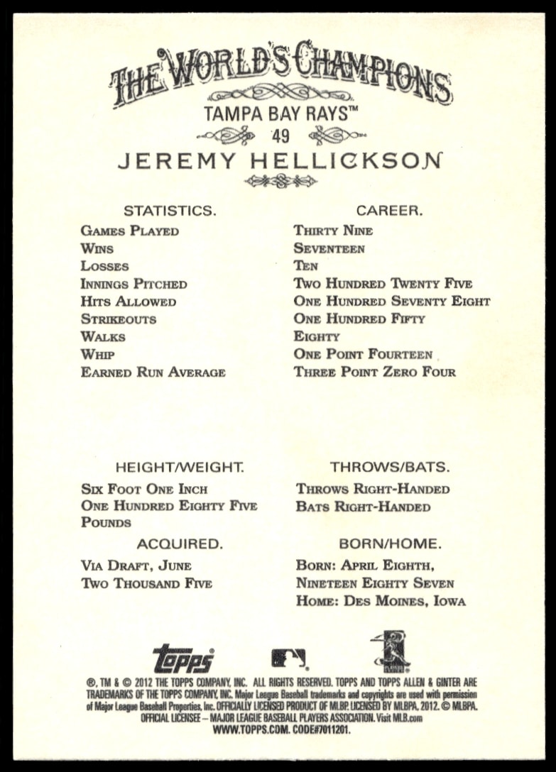 This Baseball card, from 2012 is part of the Topps Allen & Ginter card set. Jeremy Hellickson is featured and has a card number of 49.