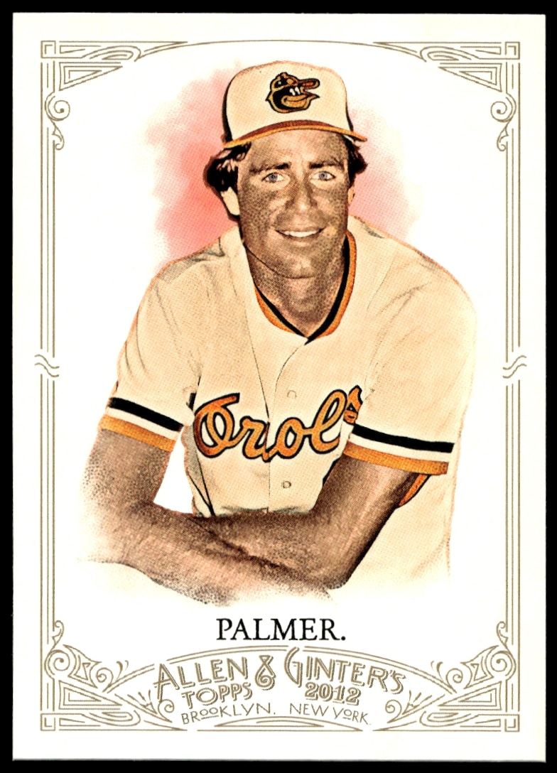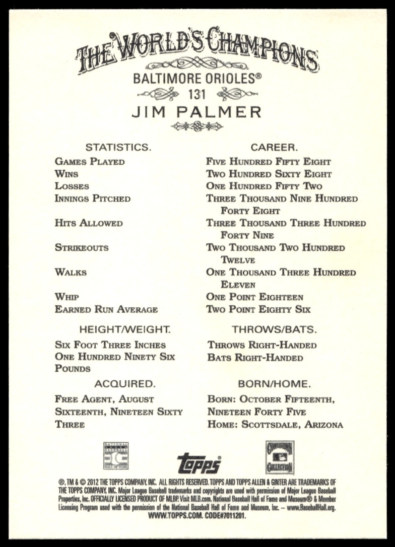This Baseball card, from 2012 is part of the Topps Allen & Ginter card set. Jim Palmer is featured and has a card number of 131.