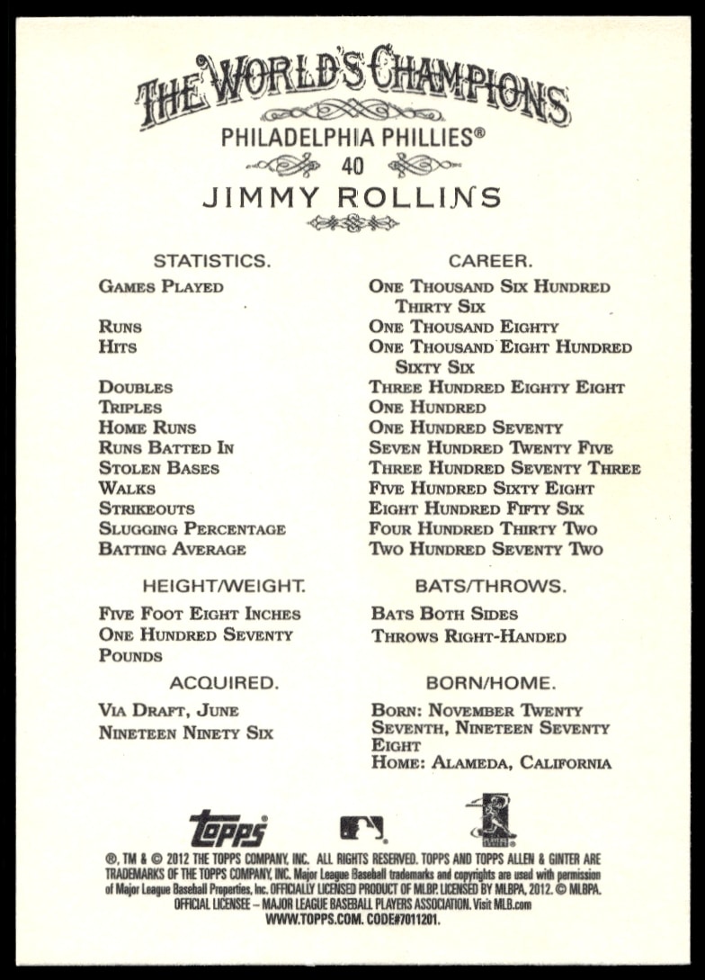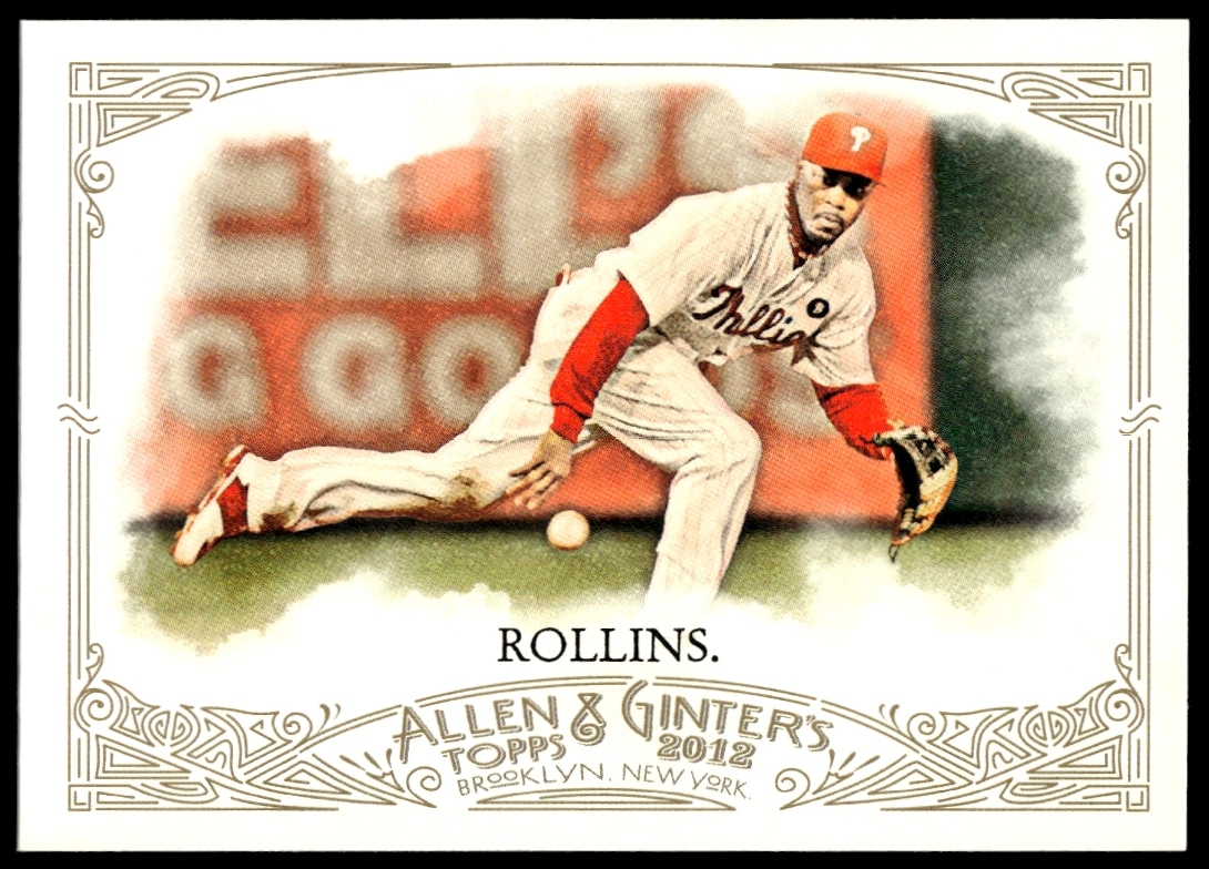 This Baseball card, from 2012 is part of the Topps Allen & Ginter card set. Jimmy Rollins is featured and has a card number of 40.