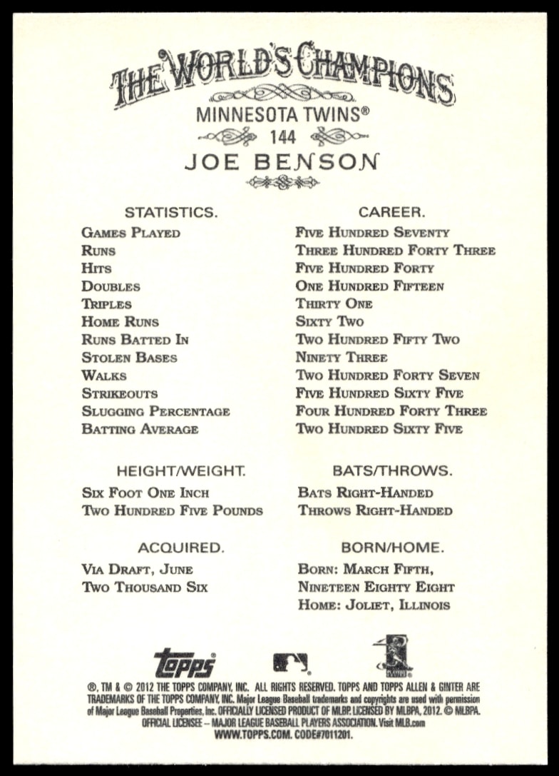 This Baseball card, from 2012 is part of the Topps Allen & Ginter card set. Joe Benson is featured and has a card number of 144.