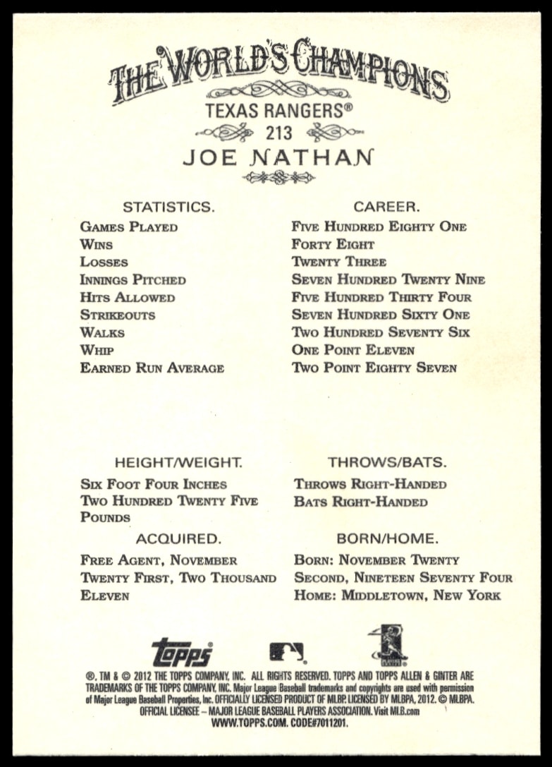 This Baseball card, from 2012 is part of the Topps Allen & Ginter card set. Joe Nathan is featured and has a card number of 213.