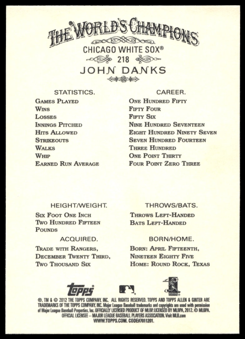 This Baseball card, from 2012 is part of the Topps Allen & Ginter card set. John Danks is featured and has a card number of 218.