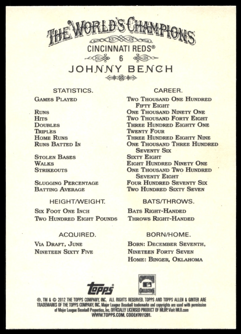 This Baseball card, from 2012 is part of the Topps Allen & Ginter card set. Johnny Bench is featured and has a card number of 6.