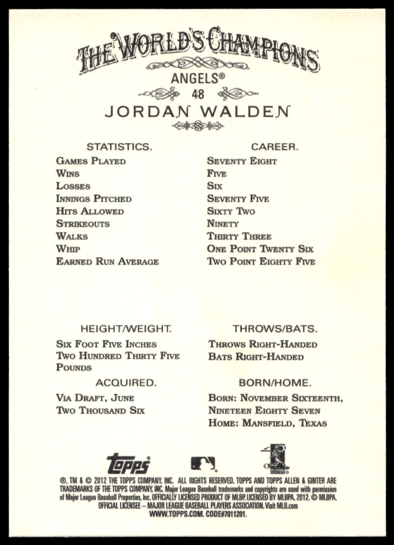 This Baseball card, from 2012 is part of the Topps Allen & Ginter card set. Jordan Walden is featured and has a card number of 48.