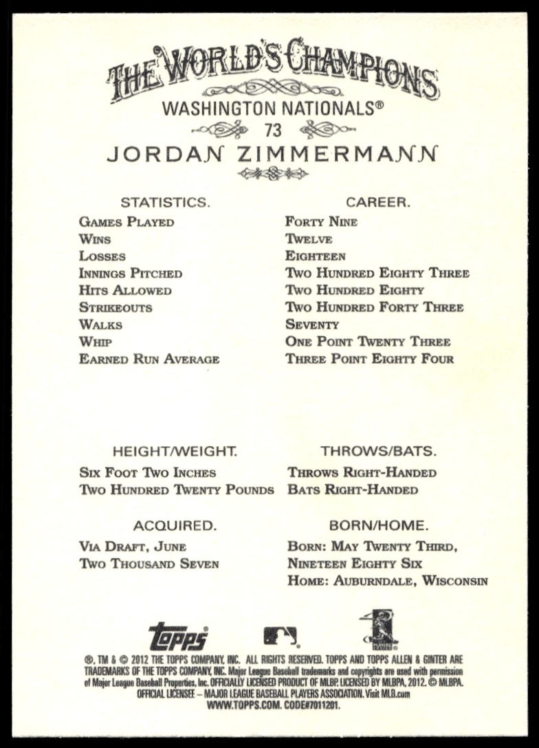 This Baseball card, from 2012 is part of the Topps Allen & Ginter card set. Jordan Zimmermann is featured and has a card number of 73.