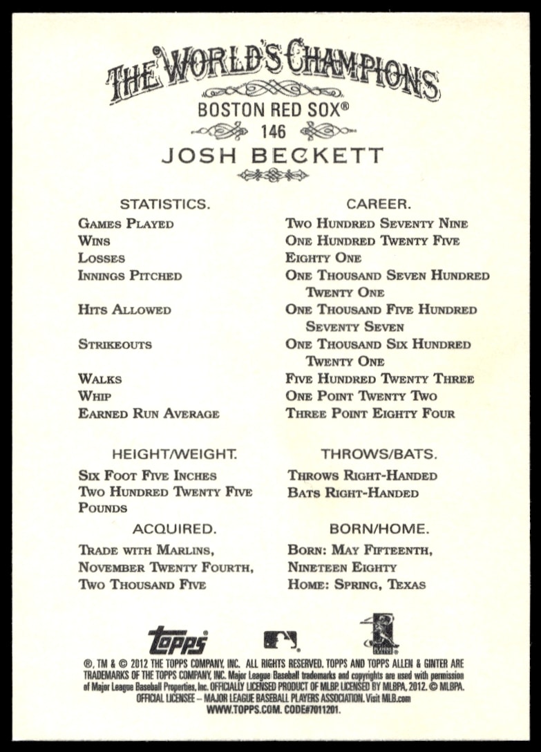This Baseball card, from 2012 is part of the Topps Allen & Ginter card set. Josh Beckett is featured and has a card number of 146.