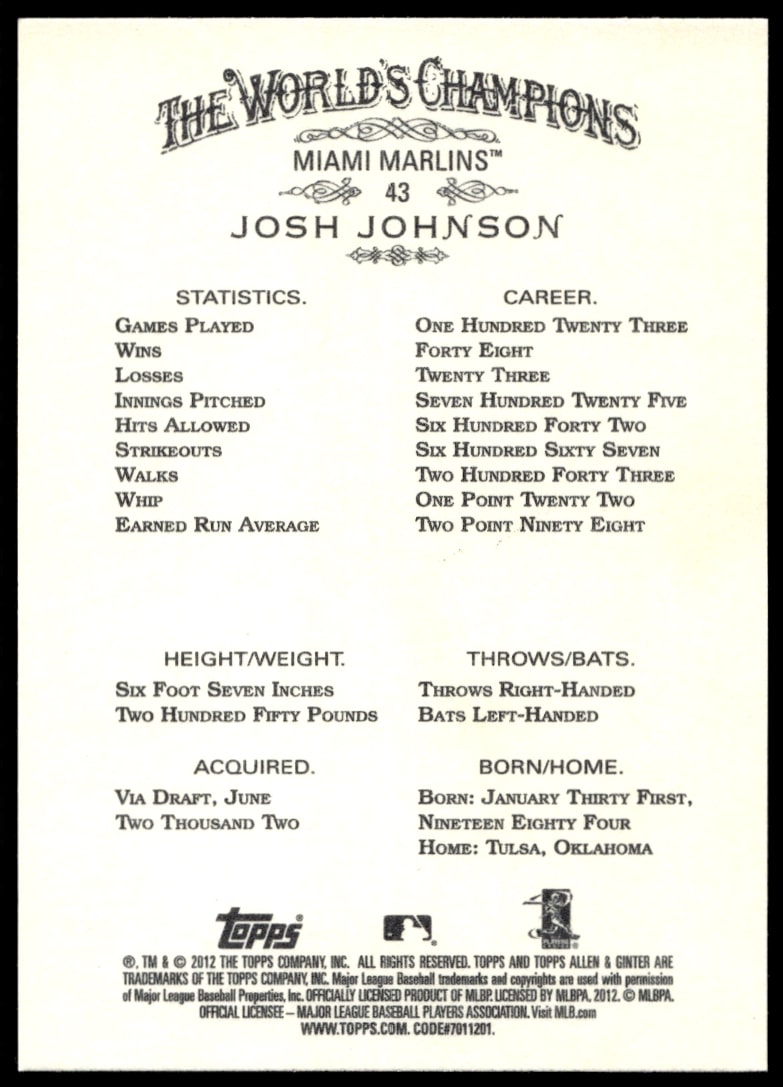 This Baseball card, from 2012 is part of the Topps Allen & Ginter card set. Josh Johnson is featured and has a card number of 43.
