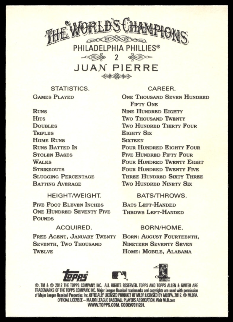 This Baseball card, from 2012 is part of the Topps Allen & Ginter card set. Juan Pierre is featured and has a card number of 2.