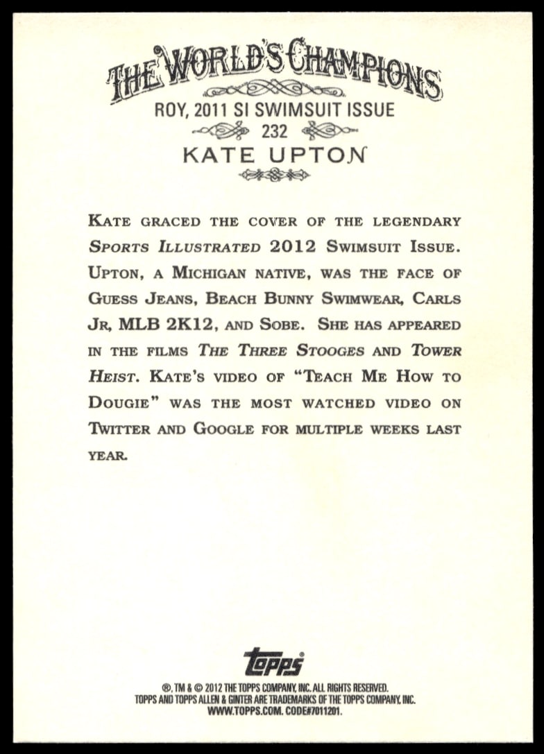 This Baseball card, from 2012 is part of the Topps Allen & Ginter card set. Kate Upton is featured and has a card number of 232.