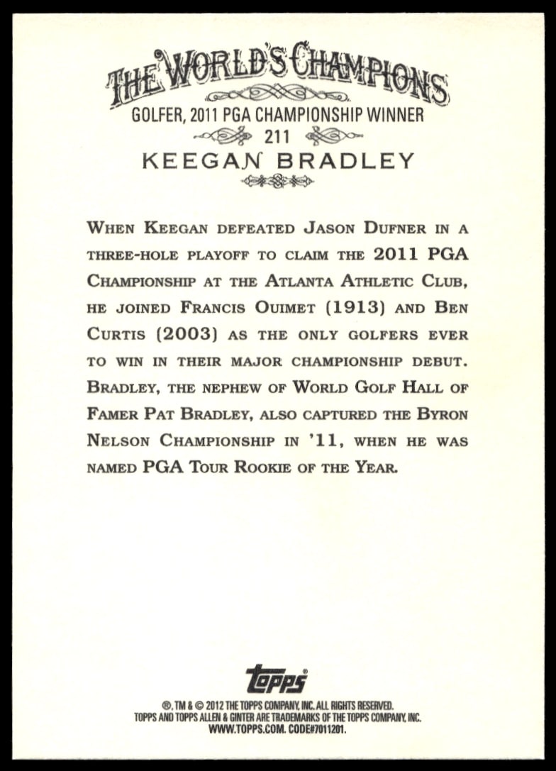 This Baseball card, from 2012 is part of the Topps Allen & Ginter card set. Keegan Bradley is featured and has a card number of 211.