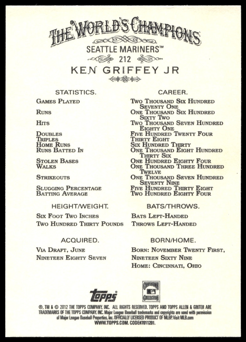 This Baseball card, from 2012 is part of the Topps Allen & Ginter card set. Ken Griffey Jr. is featured and has a card number of 212.