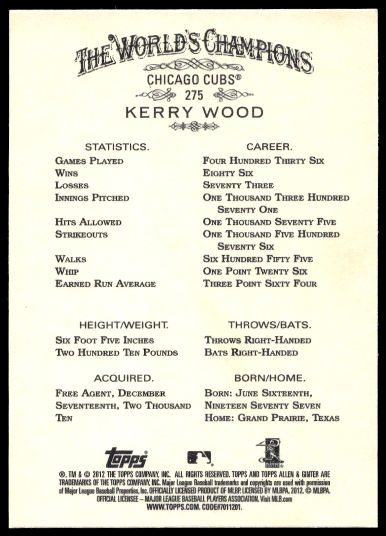 This Baseball card, from 2012 is part of the Topps Allen & Ginter card set. Kerry Wood is featured and has a card number of 275.