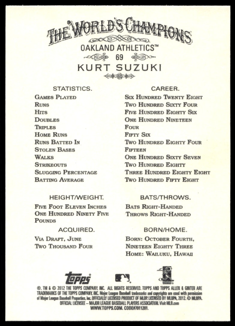 This Baseball card, from 2012 is part of the Topps Allen & Ginter card set. Kurt Suzuki is featured and has a card number of 69.