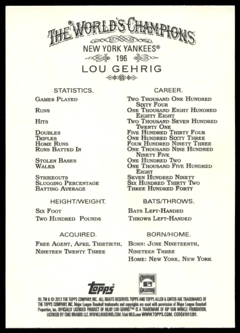 This Baseball card, from 2012 is part of the Topps Allen & Ginter card set. Lou Gehrig is featured and has a card number of 196.