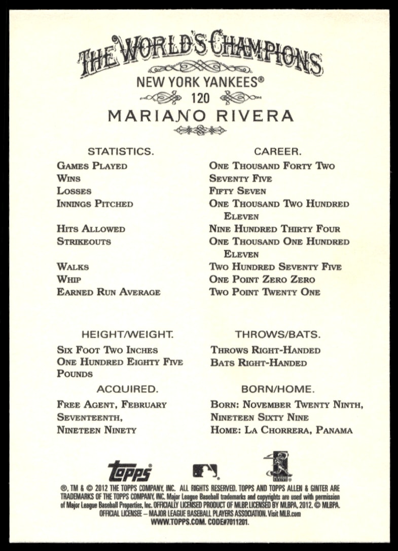 This Baseball card, from 2012 is part of the Topps Allen & Ginter card set. Mariano Rivera is featured and has a card number of 120.