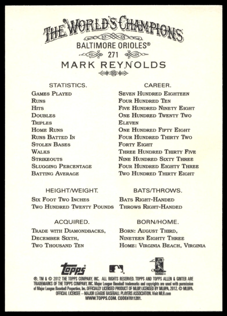 This Baseball card, from 2012 is part of the Topps Allen & Ginter card set. Mark Reynolds is featured and has a card number of 271.